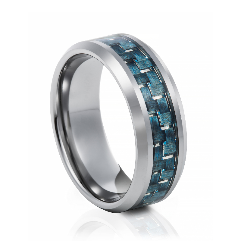 Elegant tungsten ring with straight shank and detailed with aqua carbon fiber insert and high polish edges