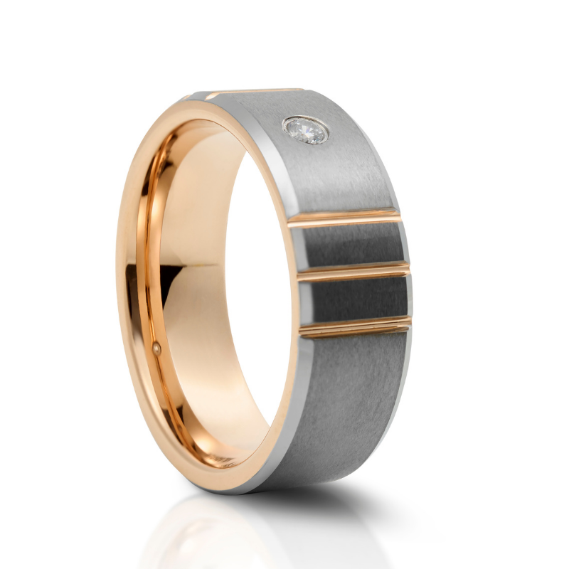 Our Brushed Grooved Tungsten Ring with Cubic features a Brushed Metal Finish with Rose Gold Grooves and Inlay. A single cubic is set delicately into the band.