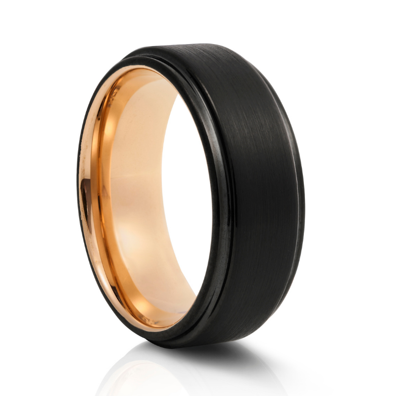 Our Matt Black and Rose Tungsten Ring is a Modern gentleman’s Wedding Band with a Brushed Metal Finish and Highly Polished Rose Gold Inner.