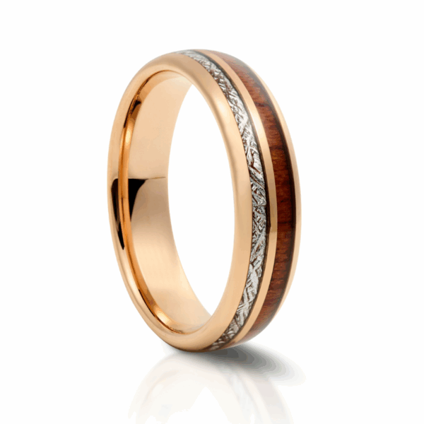 Our Meteorite and Wood Inlay Tungsten Ring features accents of Meteorite and Wood set in an Anodised Rose Gold Tungsten Band. This ring combines a modern look with a classic, homely wooden finish. Perfect for a stylish gentleman who loves a combination of textures.