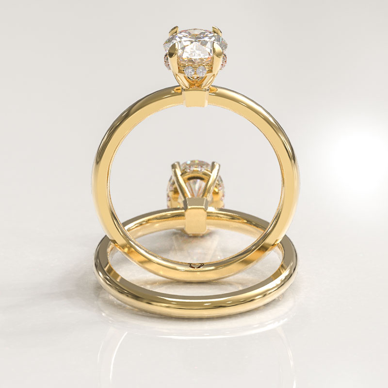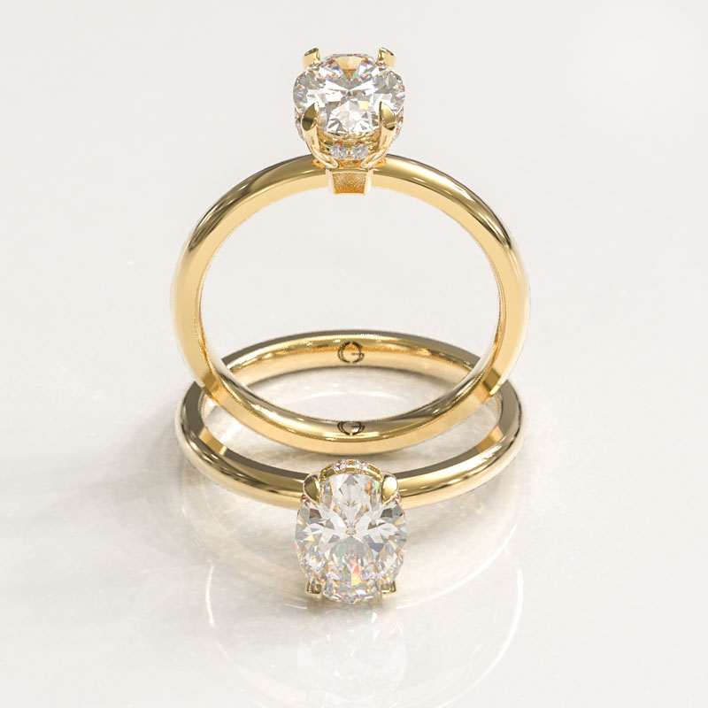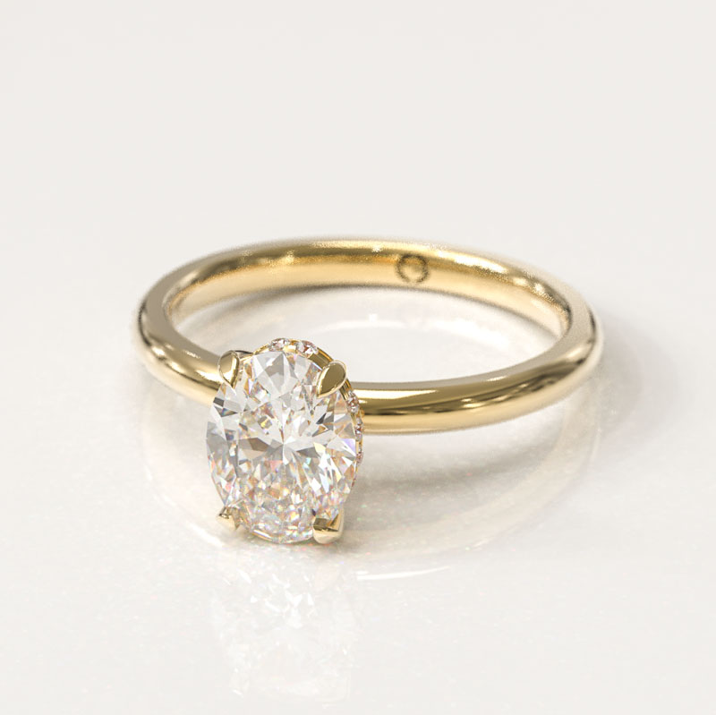 Our Four Claw Oval Cut Engagement Ring has a beautiful oval cut center stone set in four round claws on a simple band in the metal of your choice featuring a hidden halo.