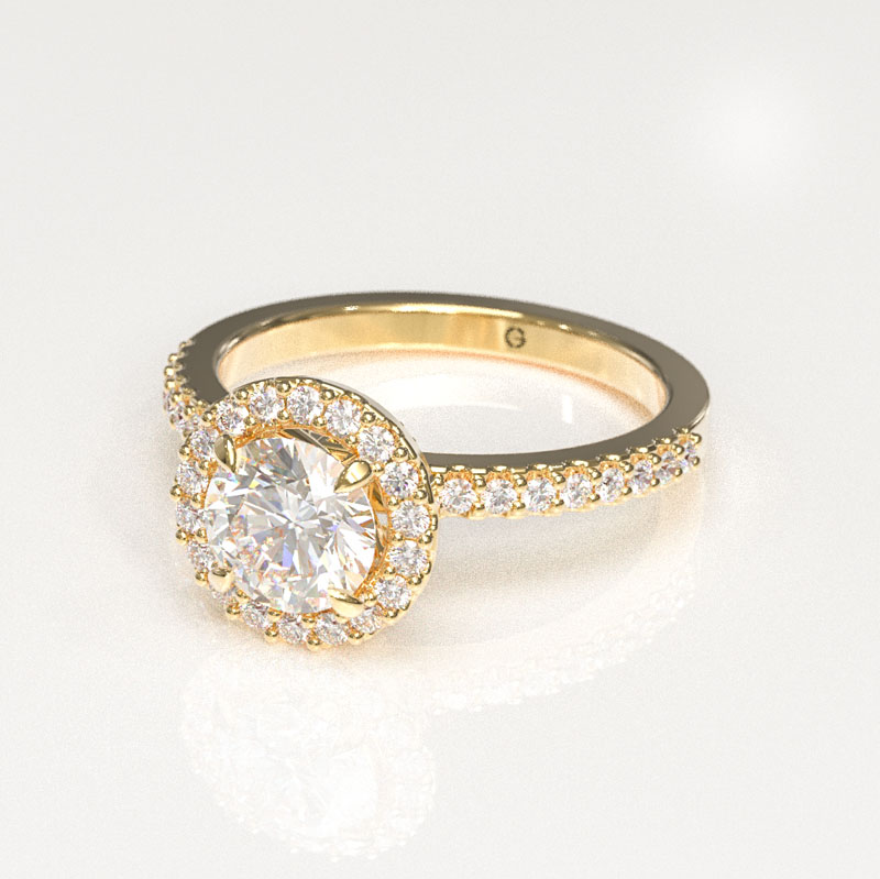 Our Round Cut Halo Ring showcases a Round center stone, elegantly set in a delicate four-claw setting. A halo surrounds the center, adding extra sparkle, while the slender micro pavé band completes the look with timeless sophistication
