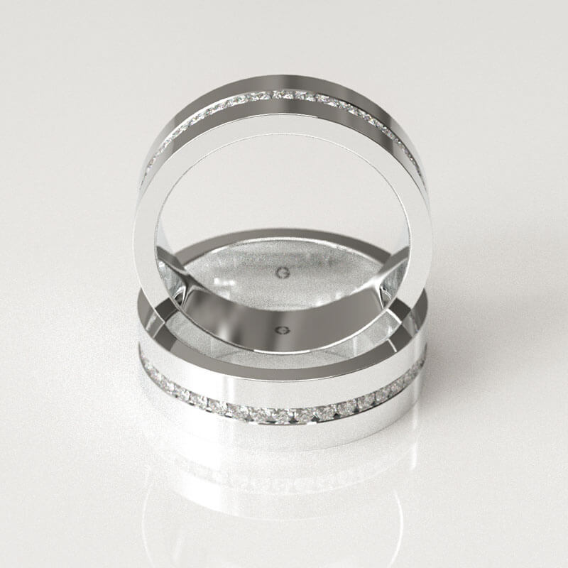 Our Full eternity ring with channel set diamonds and finely polished finish features a sleek row of brilliant diamonds set flush into the center of a bold flat band.